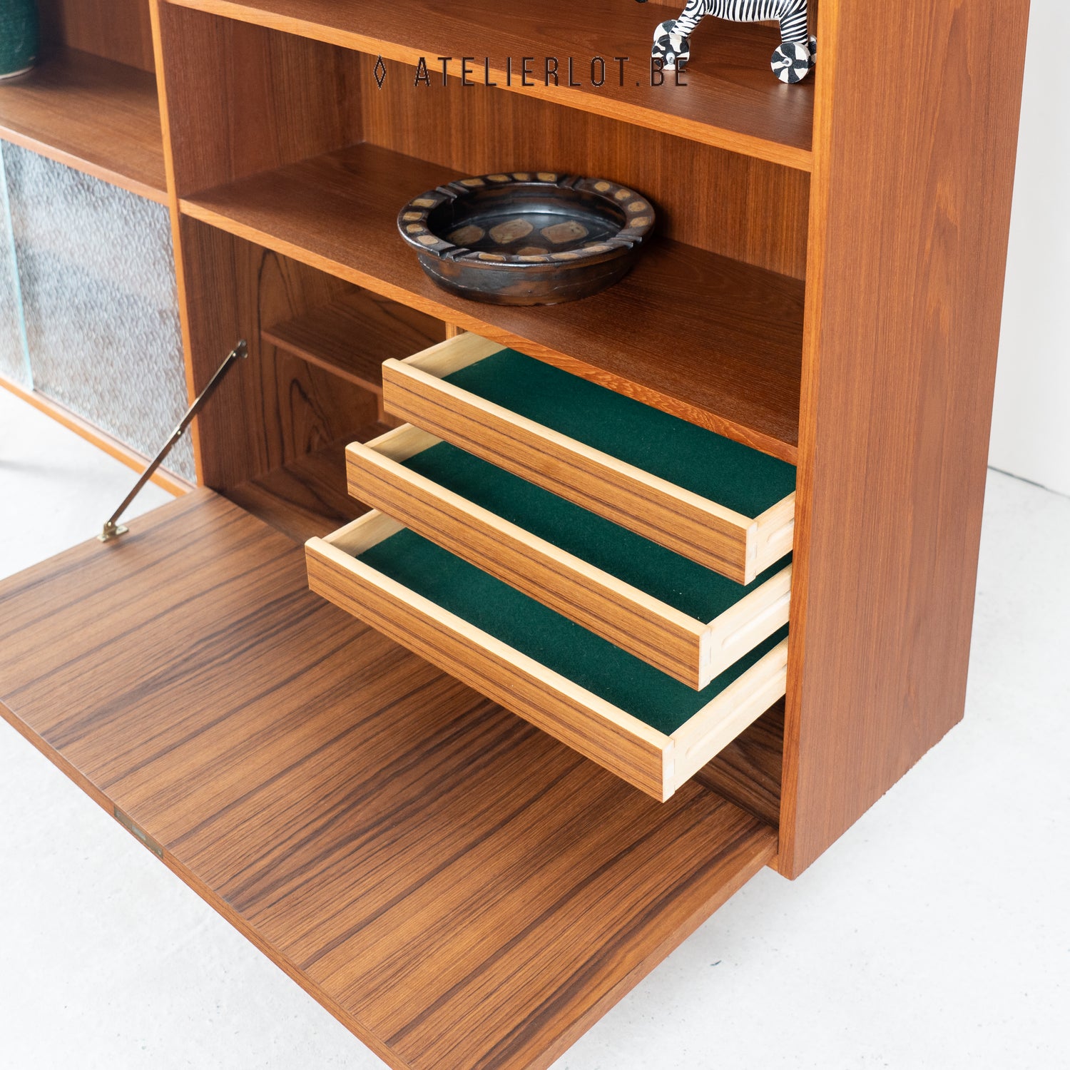 Deens wandmeubel met open vakken en 2 gesloten delen onderaan. Achter de klepdeur aan de rechterkan zijn er opnieuw een aantal vakken en 3 schuiven te vinden. Aan de linkerkant zijn er 2 schuifdeuren uit melkglas. Deze kunnen er volledig uitgehaald worden zodat ook dit gedeelte volledig open is. Het meubel verkeert in een zeer mooie staat.