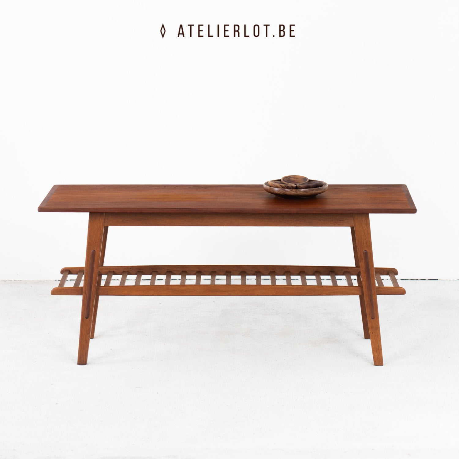 Deze jaren ’60 Deense salontafel beschikt over een elegant onderblad dat dienstdoet als subtiel rek voor tijdschriften, boeken of andere kleine voorwerpen. Het open ontwerp zorgt voor een lichte, luchtige uitstraling, terwijl het functionele tweede niveau extra opbergruimte biedt zonder afbreuk te doen aan de strakke, minimalistische lijnen van het Deense modern design.