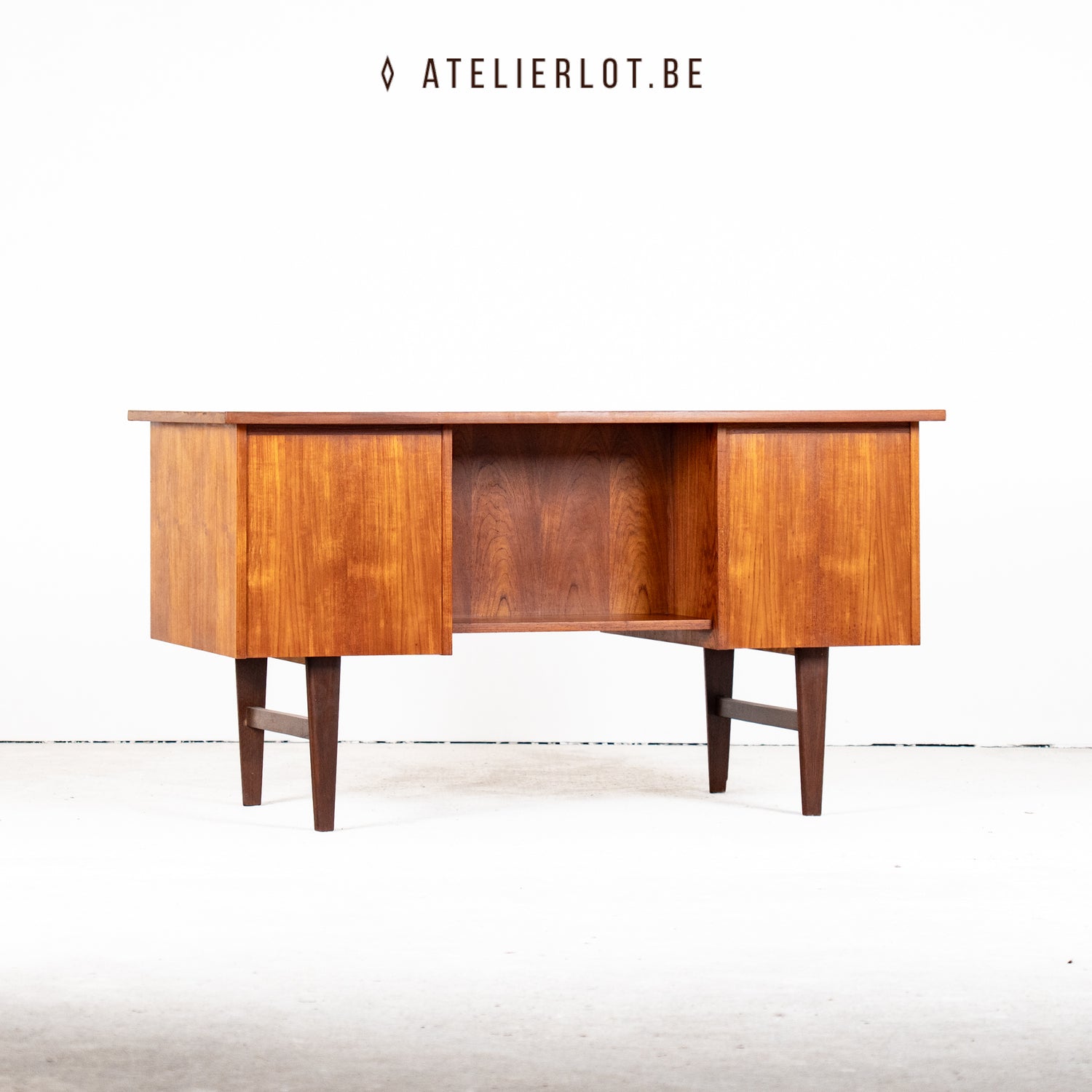 Prachtige en ruime bureau uit Denemarken, gemaakt uit zeer kwalitatieve materialen en een duurzaam ontwerp. Het meubel heeft 3 schuiven links, 3 schuiven rechts en een lade in het midden, dat voorzien is van een slot met sleutel. De achterkant is eveneens mooi afgewerkt en heeft een extra vak zodat hij ook zeer mooi tot zijn recht komt in het midden van de ruimte.