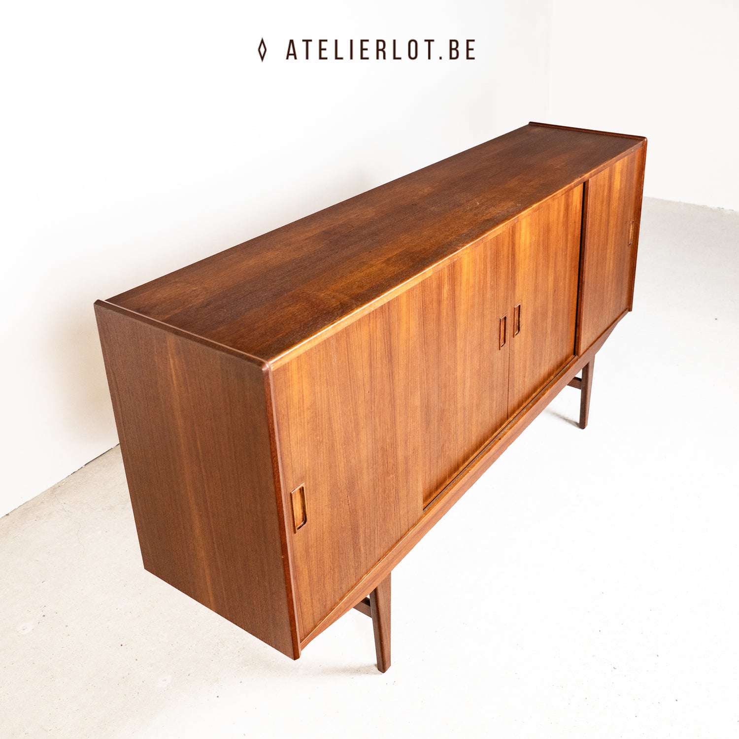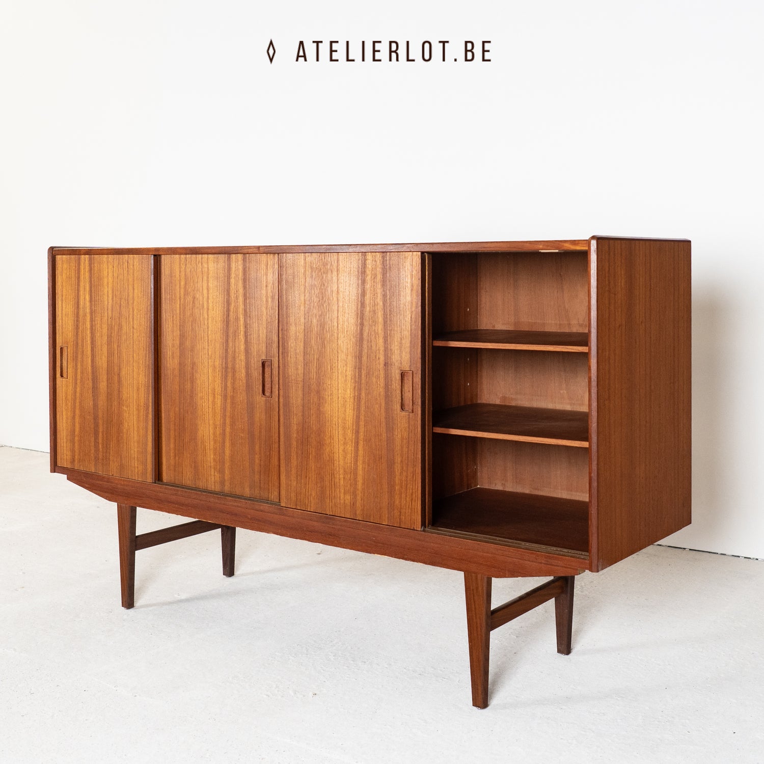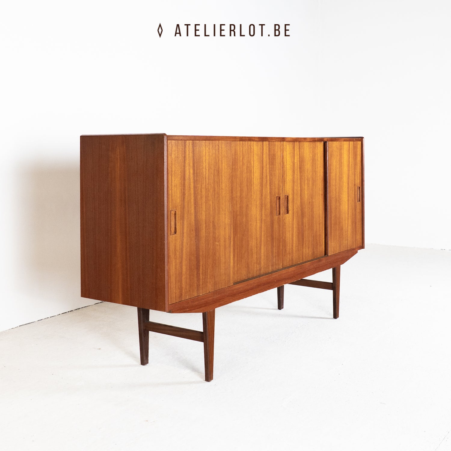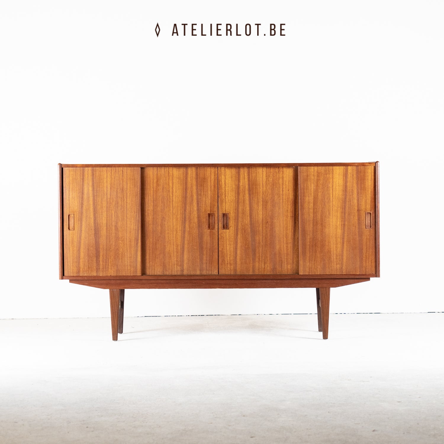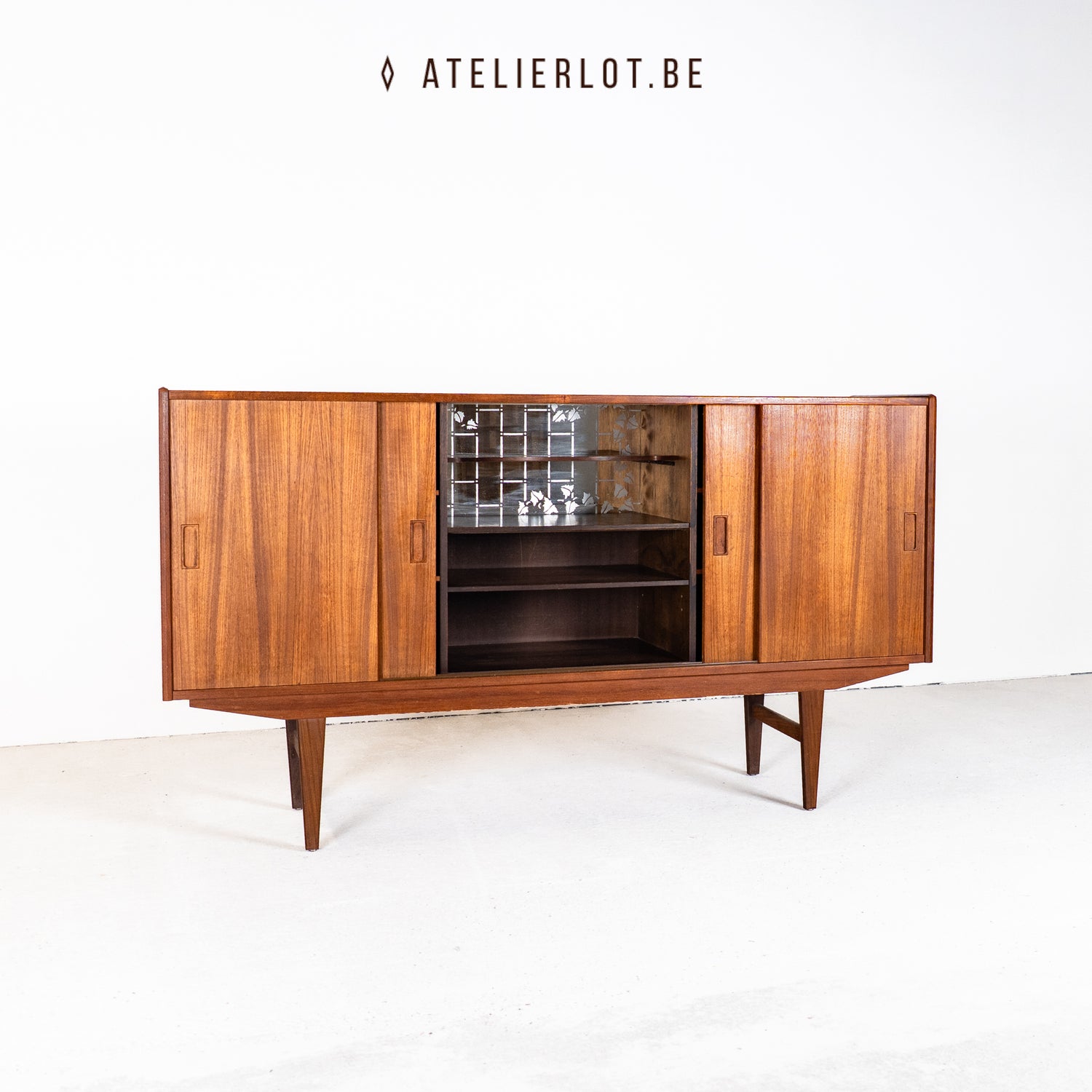 Deze Deense dressoir heeft 4 schuifdeuren met links en rechts extra legplanken en in het midden een bargedeelte. De bar heeft achteraan een spiegel met bloemmotief. Het geheel verkeert in een goede staat.