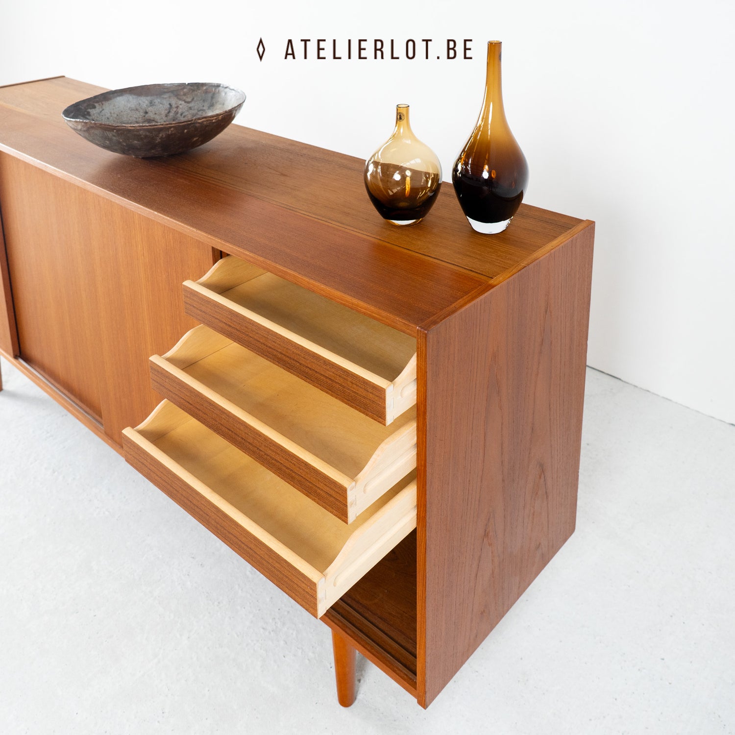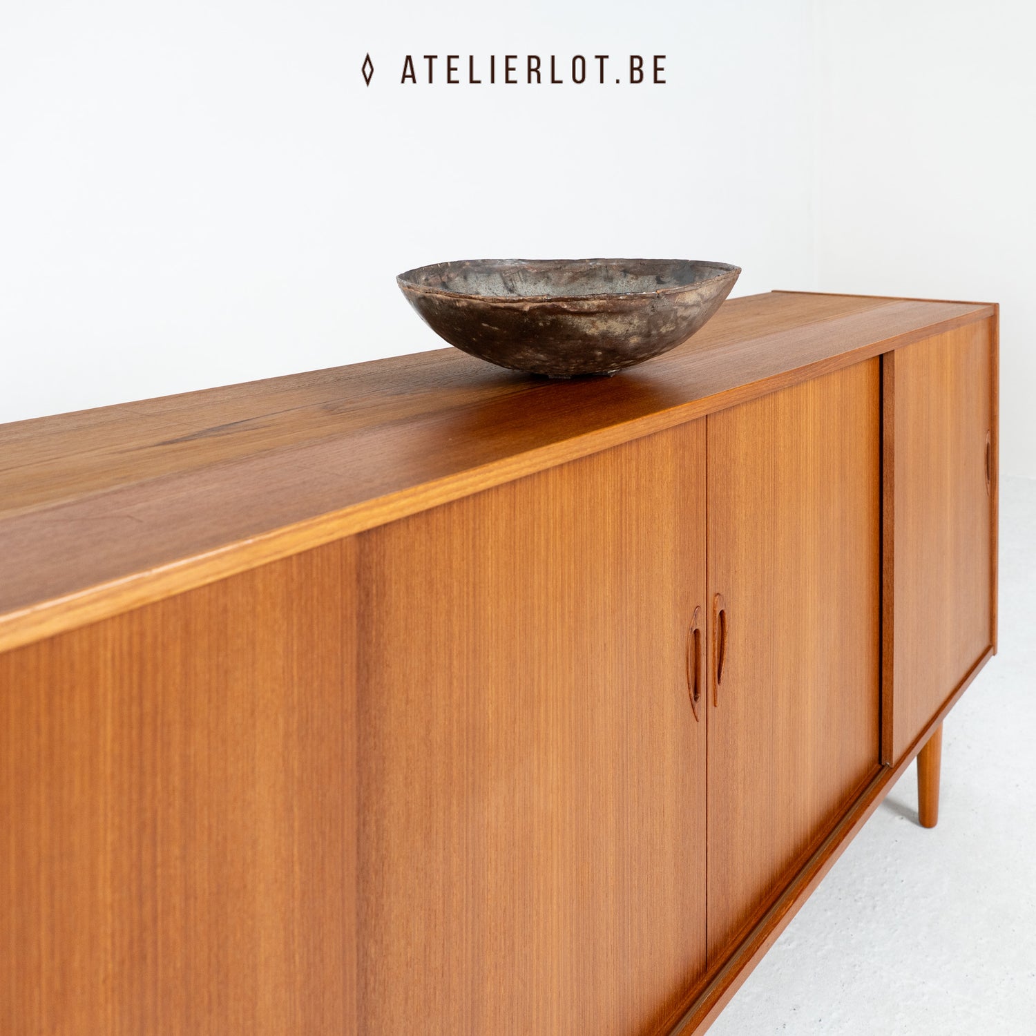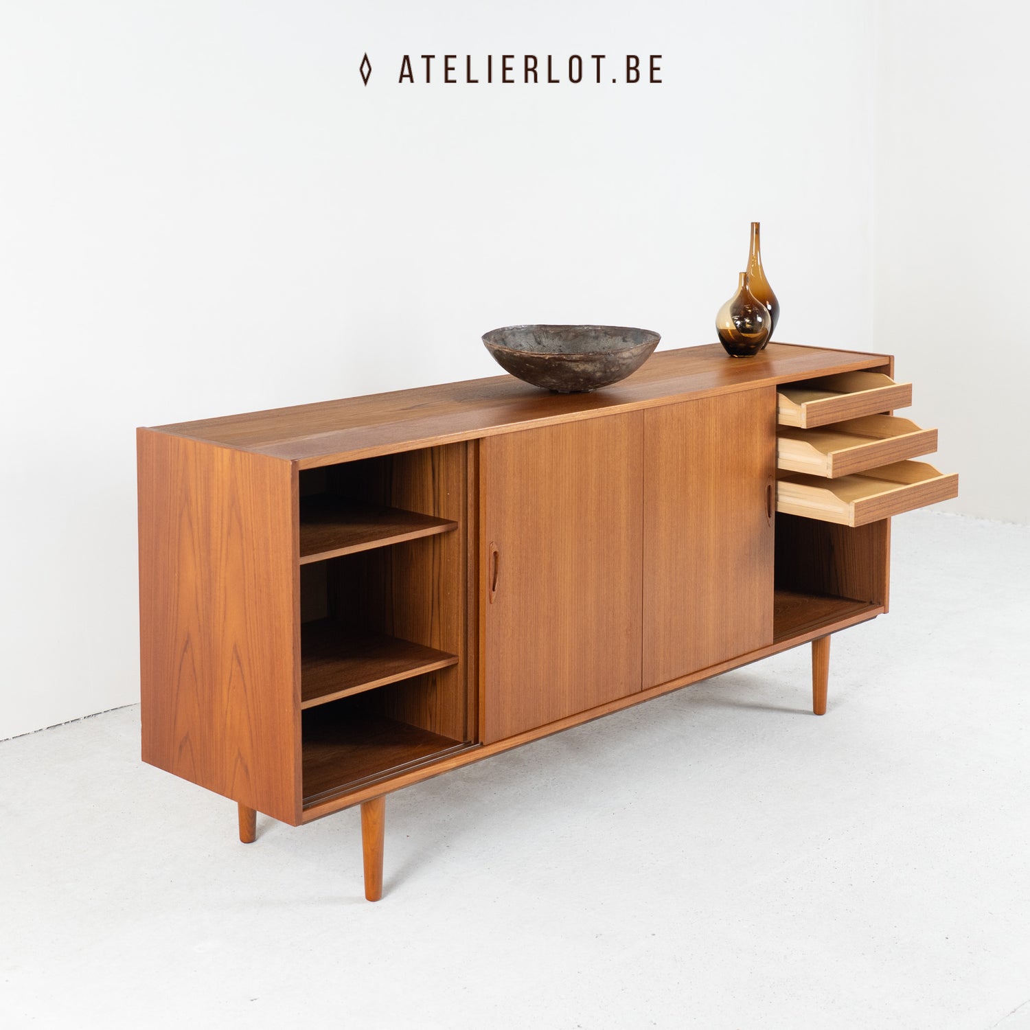 Prachtig Deens lowboard / dressoir met vier schuifdeuren. Achter de twee middelste deuren bevindt zich een ruim compartiment met een uitneembare legplank. Aan de rechterzijde zijn drie lades subtiel geïntegreerd in het ontwerp. De fraai gevormde handgrepen en de strakke belijning geven het meubel zijn karakteristieke Deense uitstraling. Het meubel verkeert in een mooie vintage staat, met subtiele gebruikssporen en een lichte verkleuring op het bovenblad door het oorspronkelijke bovengedeelte.