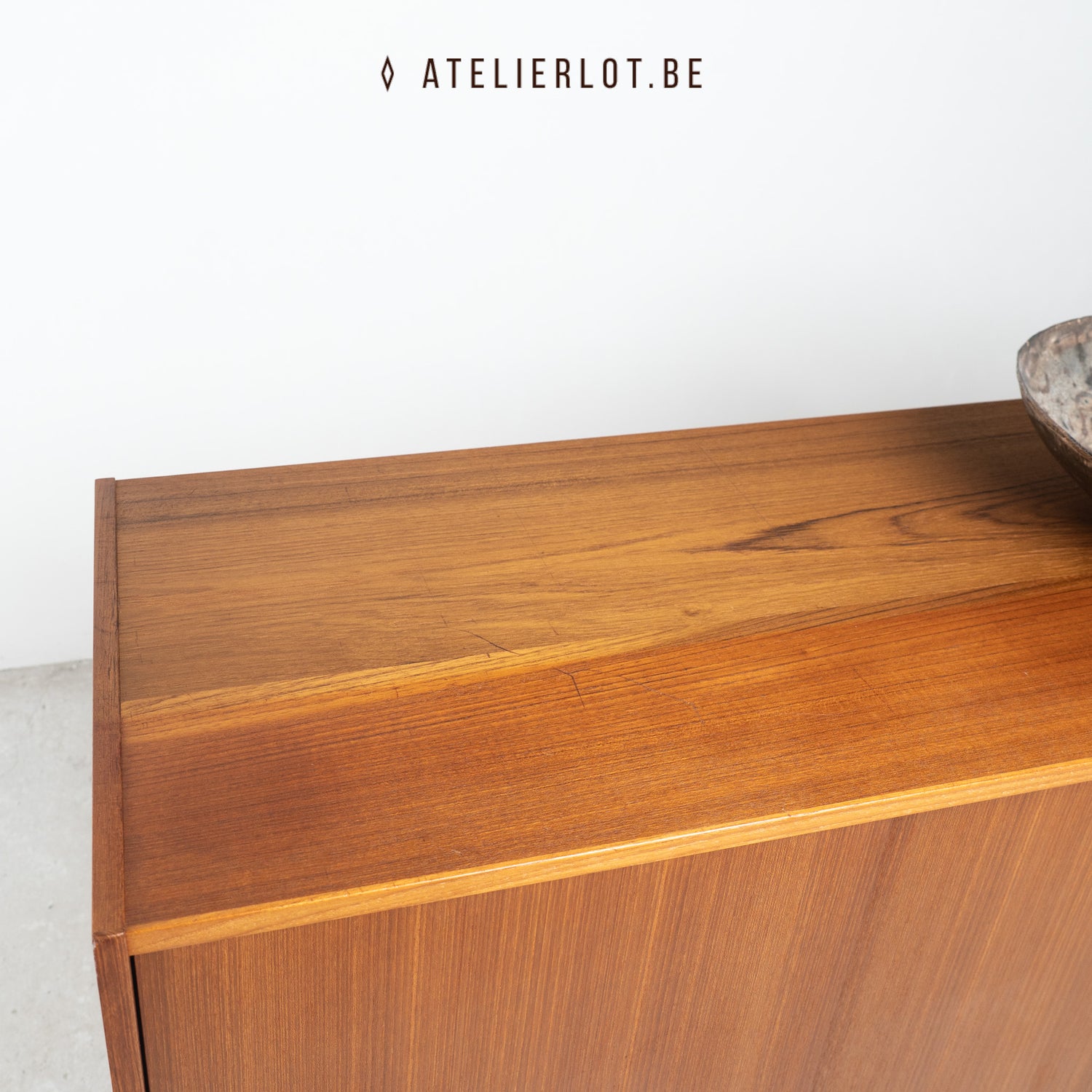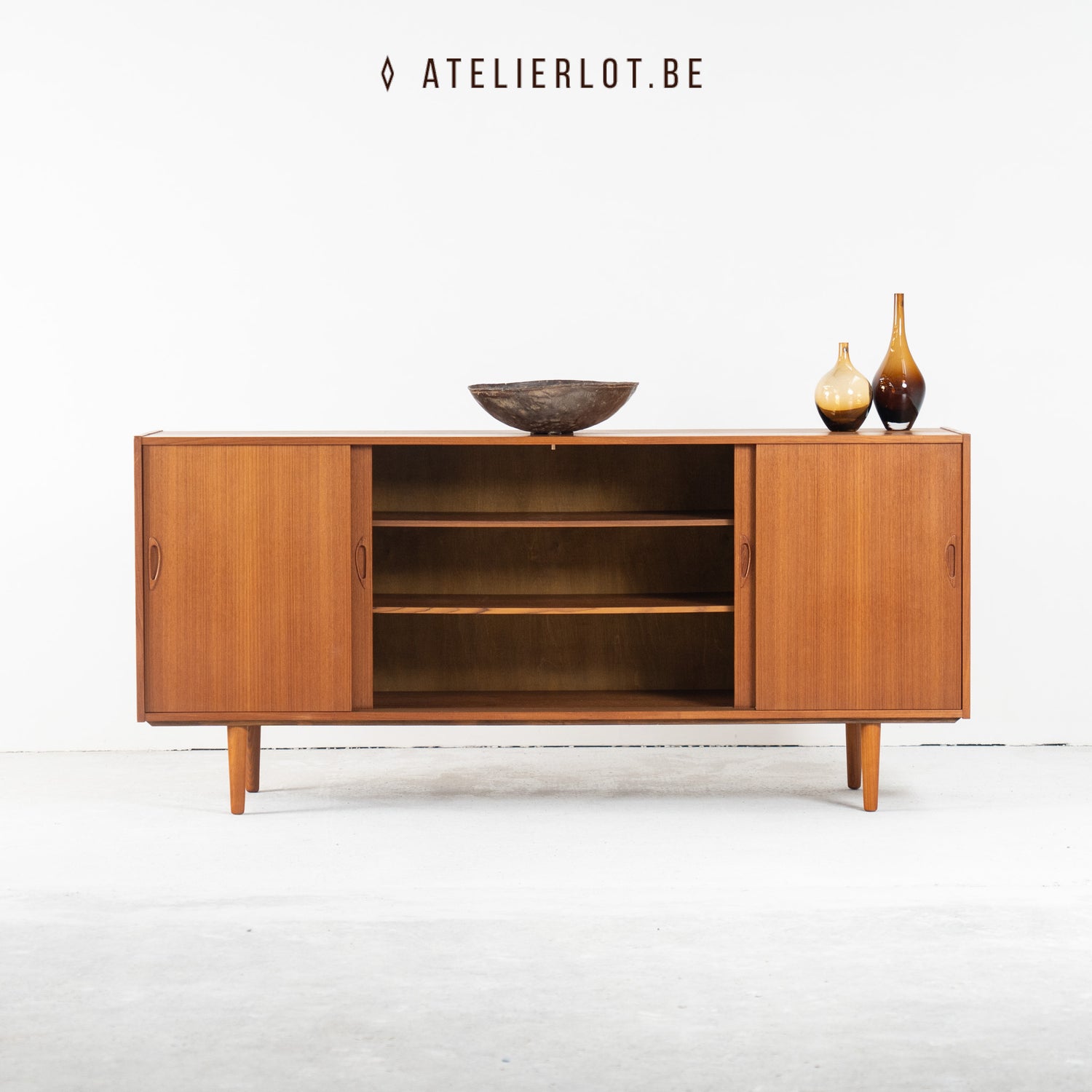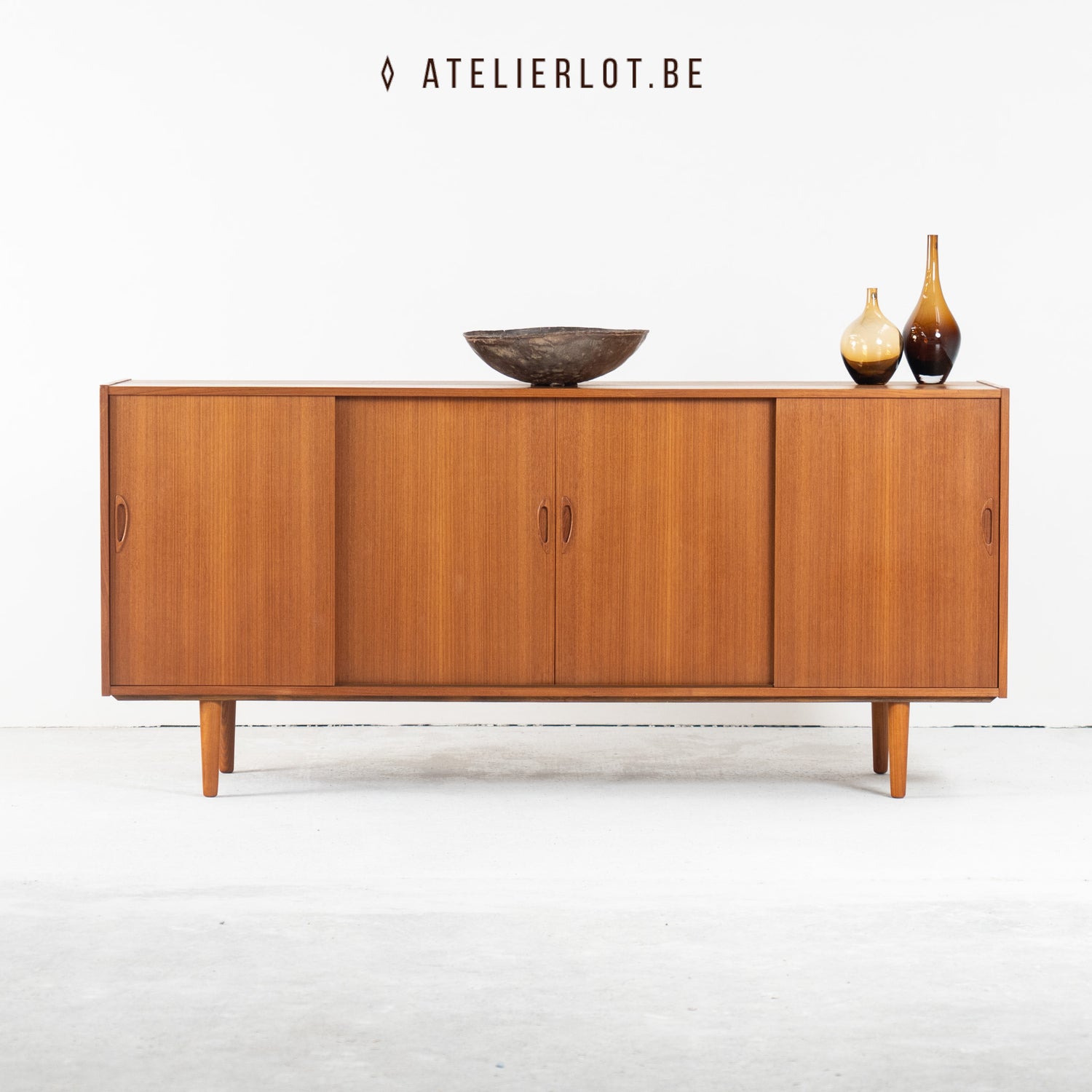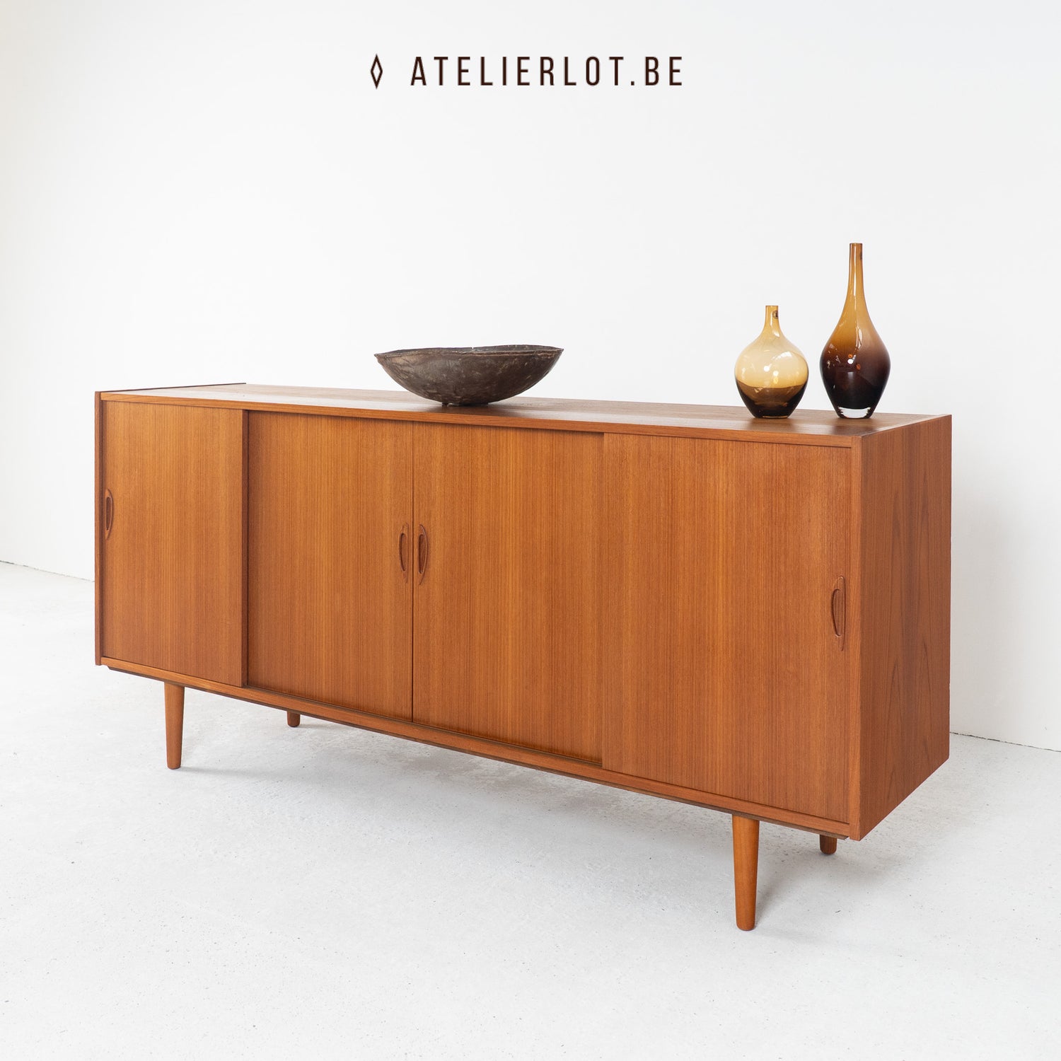 Prachtig Deens lowboard / dressoir met vier schuifdeuren. Achter de twee middelste deuren bevindt zich een ruim compartiment met een uitneembare legplank. Aan de rechterzijde zijn drie lades subtiel geïntegreerd in het ontwerp. De fraai gevormde handgrepen en de strakke belijning geven het meubel zijn karakteristieke Deense uitstraling. Het meubel verkeert in een mooie vintage staat, met subtiele gebruikssporen en een lichte verkleuring op het bovenblad door het oorspronkelijke bovengedeelte.