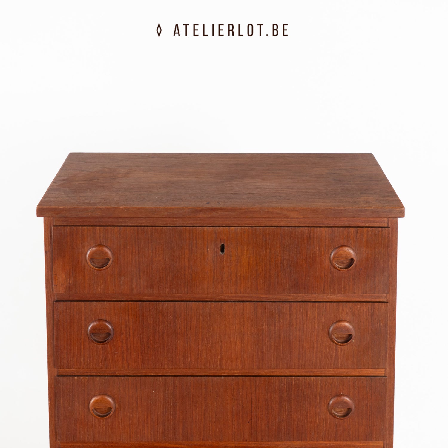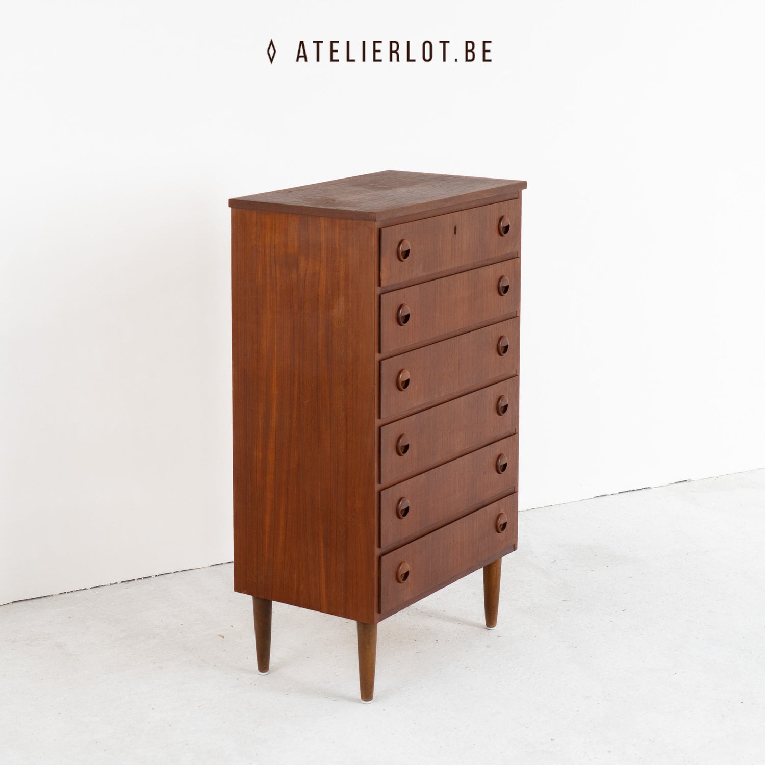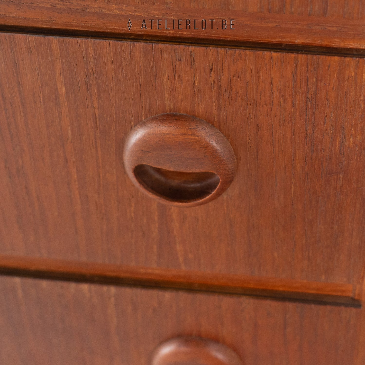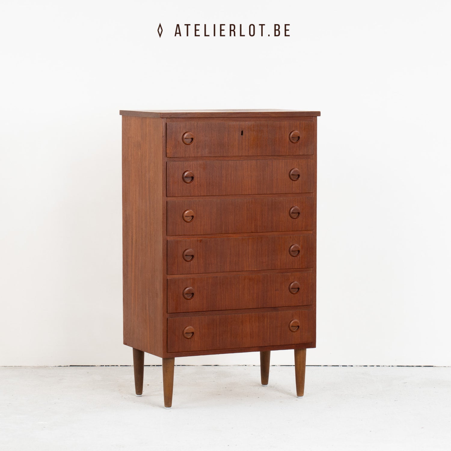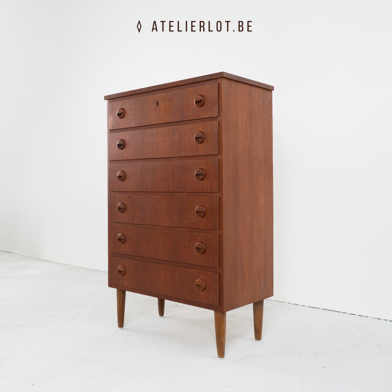 Vintage Deense ladekast met 6 ruime schuiven en karakteristieke ronde handgrepen. Een prachtig voorbeeld van Deens design uit de jaren ’60. Verkeert in goede staat.