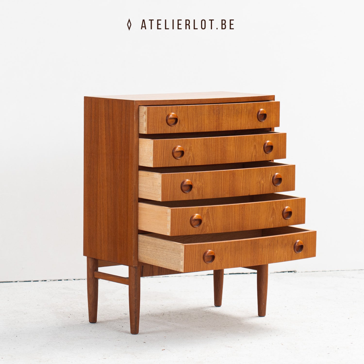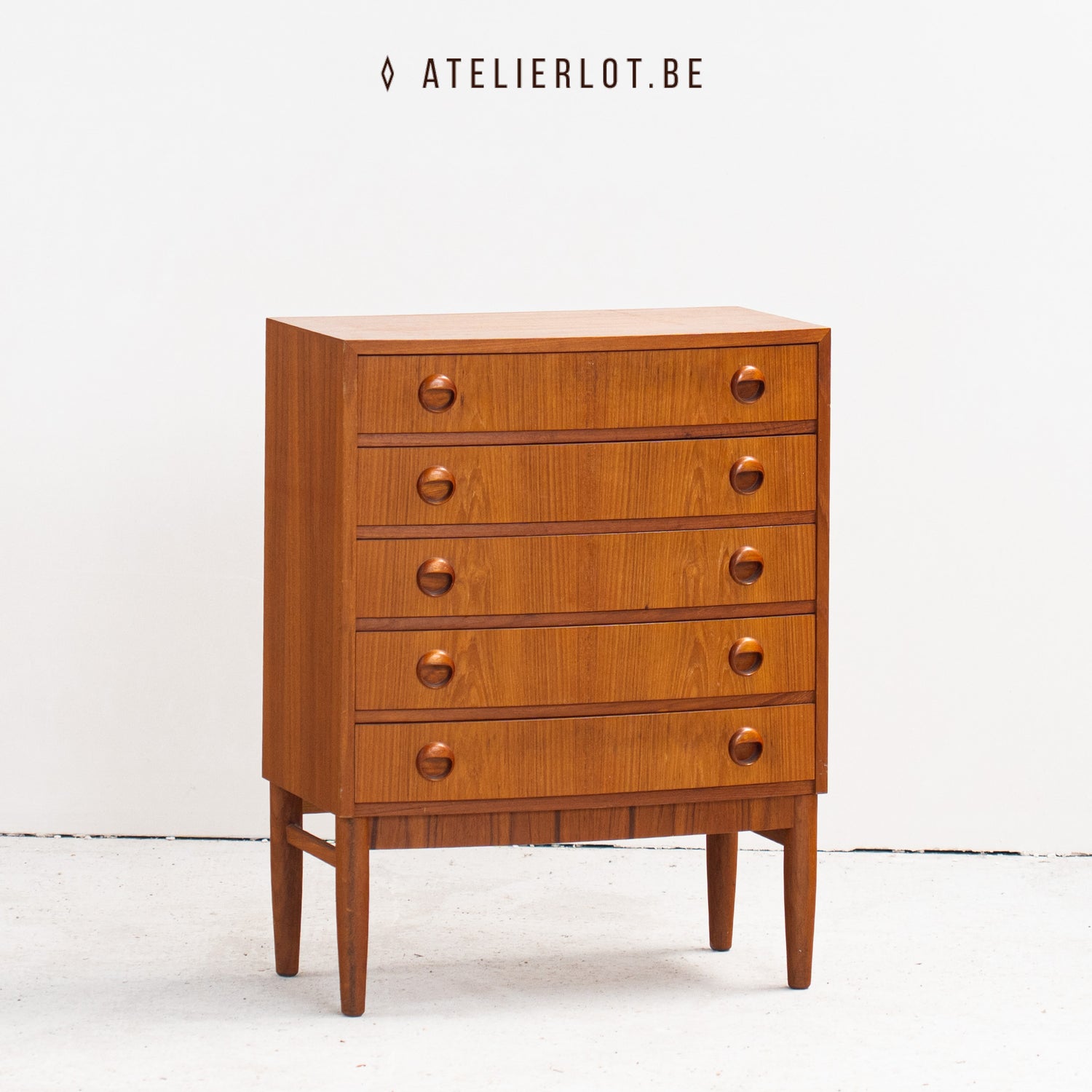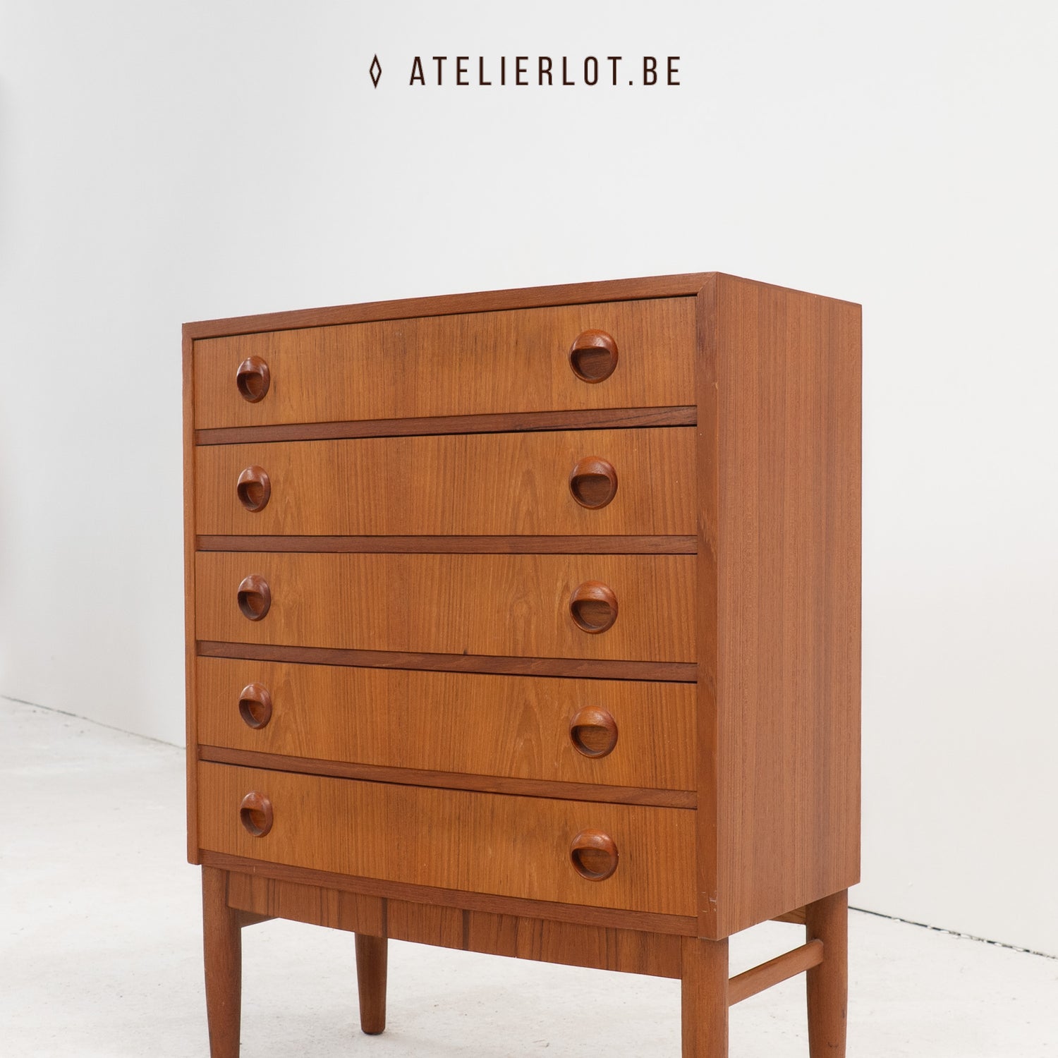 Vintage Deense ladekast met 5 schuiven onder elkaar. De handgrepen zijn typisch voor de jaren '60 en geven het meubel een stijlvolle toets. De subtiel gebogen vorm, waarbij de schuiven licht naar voren bollen, benadrukt het verfijnde design. Het meubel verkeert in perfecte staat.
