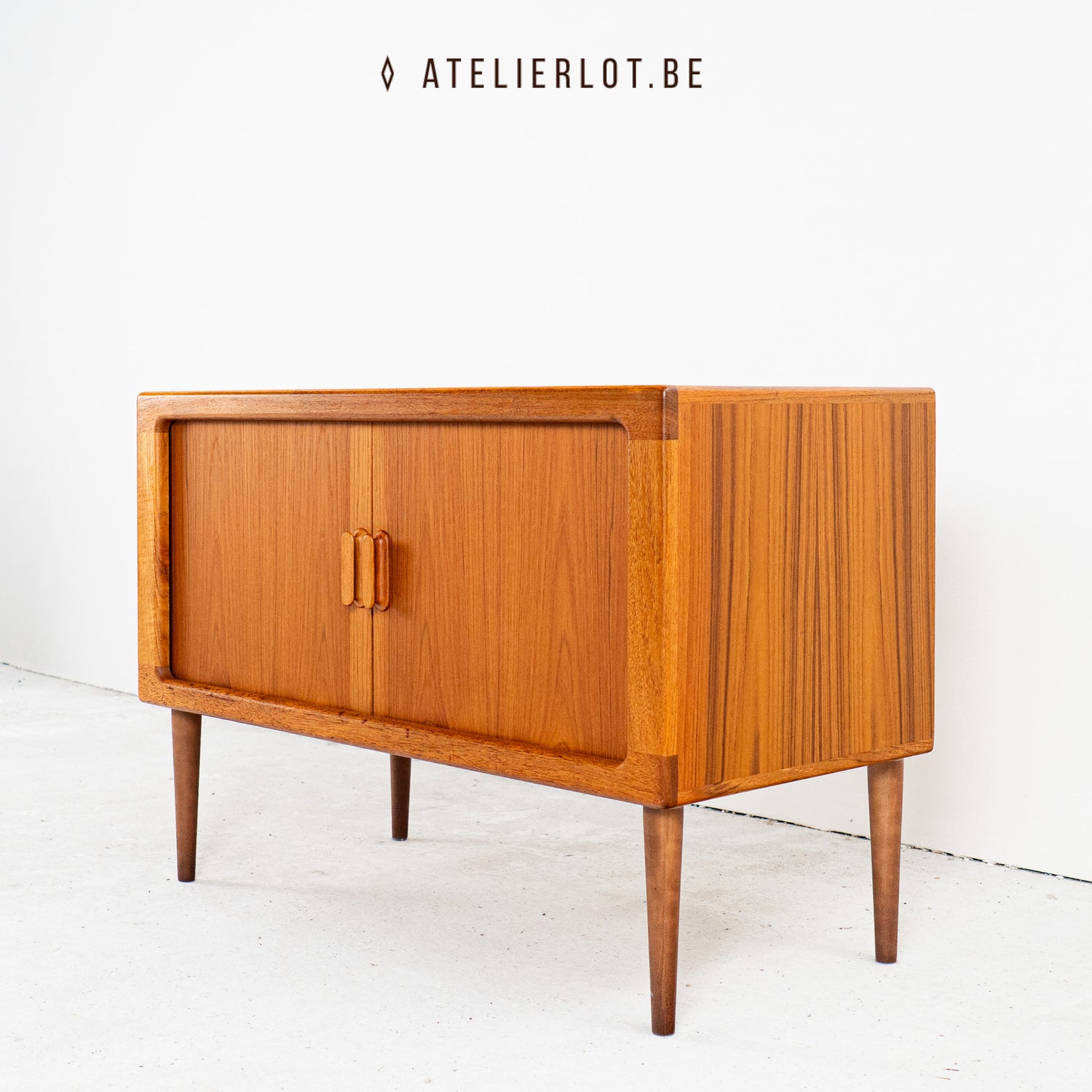 Stijlvolle vintage lowboard of platenkast van Svend Dyrlund uit Denemarken. Het meubel is voorzien van rolluikdeuren met elegante handgrepen in teakhout, die soepel naar binnen schuiven en volledig in de kast verdwijnen – zowel praktisch als esthetisch.